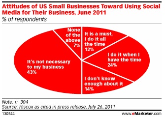 ![]() Thursday, August 11, 2011 As we sit firmly entrenched in the social media revolution, many small and medium sized businesses have taken cues from larger corporations when it comes to building a presence. Is social media integration a good idea for small business? Is it a necessity? A recent survey concludes that despite its prevalence, social media is not yet seen as a "must-do" by owners. eMarketer has reported on small-business insurance provider Hiscox's report on thoughts surrounding social media use by business owners. They surveyed 304 "decision-makers" within small businesses. What they found was only 12% surveyed said that "it is a must" an that they engage in social media "all the time." A whopping 43% said that it's not necessary for their business at all. ![]() As you can see, 24% seemed apathetic, saying that they would use it whenever they had the time. Only 4% said that they simply could not live without social media. On the other end of the spectrum, word-of-mouth advertising is the thing that most owners said they could not do without. 50% of those surveyed listed it as their #1 tool. For those who embrace social media as a critical tool, what was the most popular network? The answer is Facebook, with 19% saying that they used it for their business. 15% reported LinkedIn use and only 4% are using Twitter. Social media is a powerful tool, but it might be true that it isn;t necessary for everybody. Something like Facebook or Twitter's effectiveness is directly linked to the amount of contacts - friends or followers - that a business has. Once you gain a social presence, however, the possibilities are great. Plus, social media marketing is both incredibly easy to use and cheap. Do you use social media for your business? if so, what outlet? Let us know in the comments.